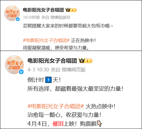 但在春暖花开的清明档期,这部催泪片,却很难安利出去。想到去年五一档《水饺皇后》因催泪三板斧的套路模式暴露出“预制催泪片”的市场瓶颈,为什么《阳光女子合唱团》这样一部情绪渲染更扎实的催泪片也不好卖了,观众开始抵触好哭的电影了吗?